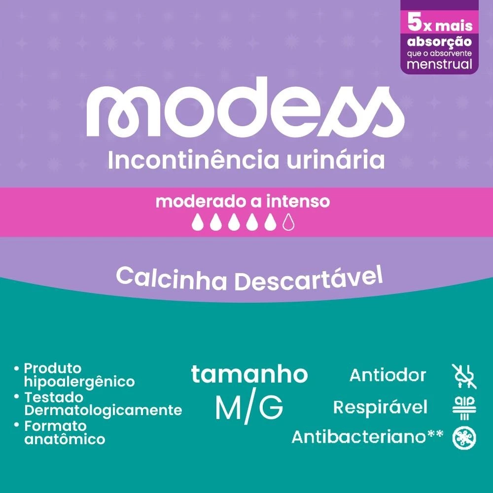 Indicado para incontinência urinária moderado a intenso. Tamanhos M/G – Quadril: 100 – 110 cm Os produtos são válidos por 2 (dois) anos após data de fabricação se mantidos fechados em locais secos. As Calcinhas descartáveis Modess Incontinência, foram desenvolvidas pensando no bem estar da mulher, com a função 2 em 1, absorvendo e retendo a urina e menstruação, proporcionando proteção contra vazamentos, apresenta a tecnologia respirável para evitar abafamentos durante o uso, tecnologia antibacteriano reduzindo o crescimento de microrganismo, tecnologia antiodor permitindo a neutralização e controle do odor, com fios elásticos garantindo ajuste ao corpo, cobertura suave e macia proporcionando conforto durante o uso.