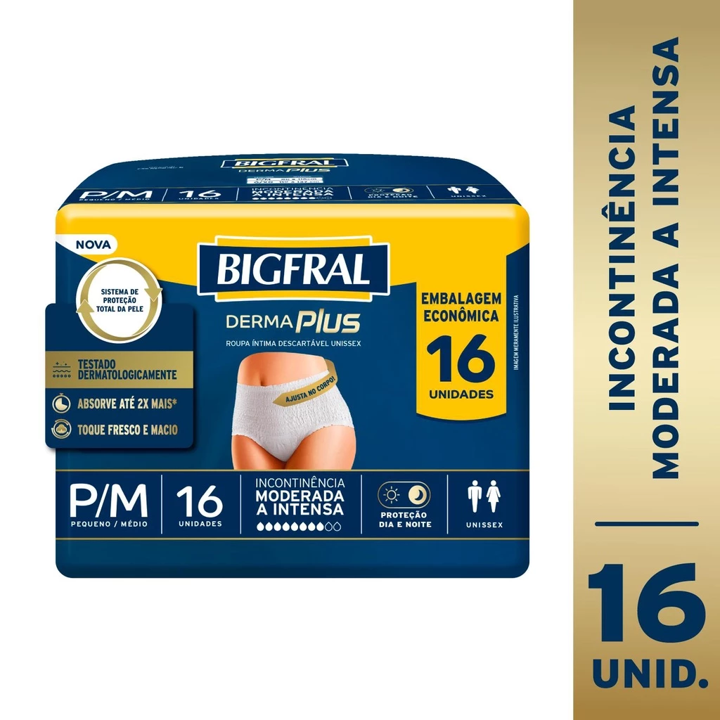 A nova roupa íntima Bigfral Derma Plus possui sistema de proteção total da pele, é dermatologicamente testada, absorve até 2x mais para que a pele não fique úmida deixando-a mais seca e protegida e possui toque fresco e macio. Indicada para homens e mulheres com incontinência urinária moderada a intensa. Veste como sua roupa íntima habitual e garante todo conforto e segurança para manter sua rotina.