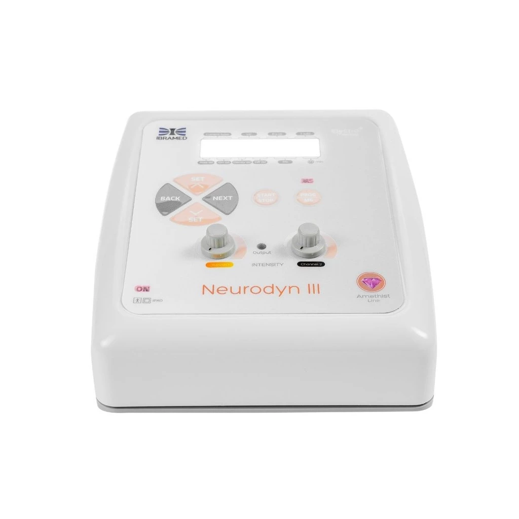 O Neurodyn III é um equipamento microcontrolado para aplicação de corrente elétrica via eletrodos em contato direto com o paciente para terapias de disfunções neuromusculares. Possui as correntes TENS e FES. A técnica consiste na aplicação de suave estimulação elétrica através de eletrodos colocados em áreas corporais afetadas pela dor (TENS), ou ativar os músculos esqueléticos e produzir movimentos (FES). A intensidade da corrente necessária ao tratamento varia com o tipo de disfunção que será tratada bem como com o limiar de sensibilidade de cada paciente, e é por isso que o tratamento deve iniciar com níveis de intensidades mais baixos, aumentando cuidadosamente de acordo com a resposta sensorial, motora e dolorosa referida pelo paciente. Com o Neurodyn III é possível trabalhar nos seguintes modos de operação: TENS convencional, TENS VIF, TENS Burst, FES Sincronizado, FES Recíproco, FES Sincronizado VIF, FES Recíproco VIF.