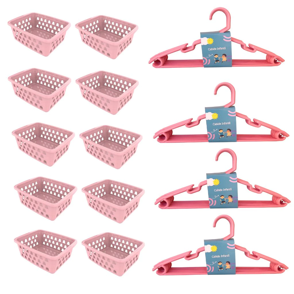 Kit 10 Cestos Organizador Pequeno Multiuso Rosa + 20 Cabides Infantil Bebê Rosa