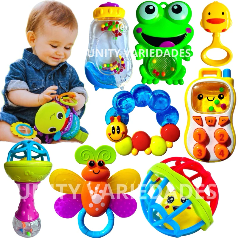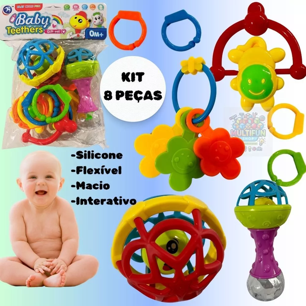 KIT CHOCALHO MORDEDOR BRINQUEDO PARA BEBÊ INTERATIVO SILICONE MACIO 8 PEÇAS – ENVIO IMEDIATO