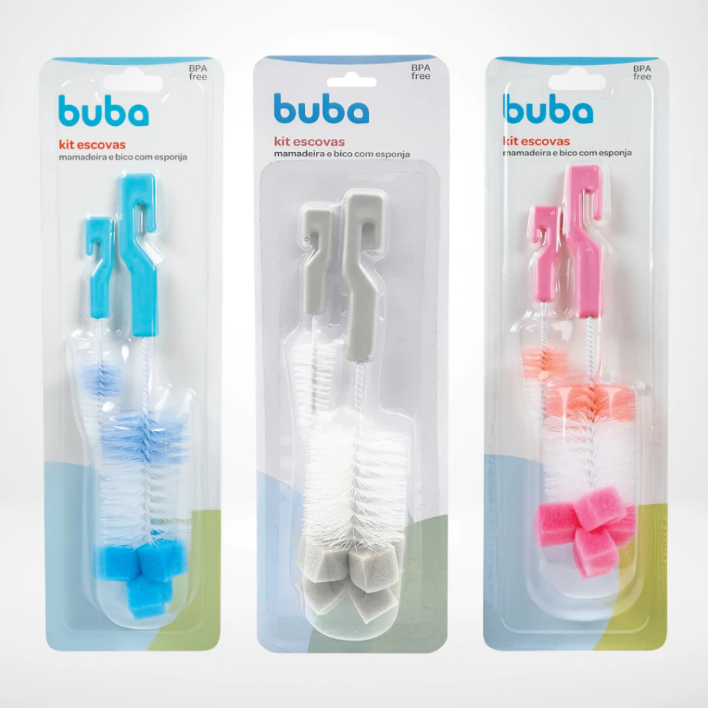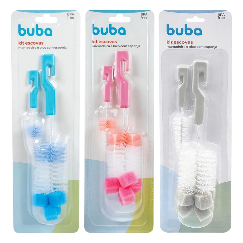 Kit Escova para Mamadeira E Bico Buba Higiene Com Esponja Limpeza Bebê Garrafas Azul Cinza Rosa