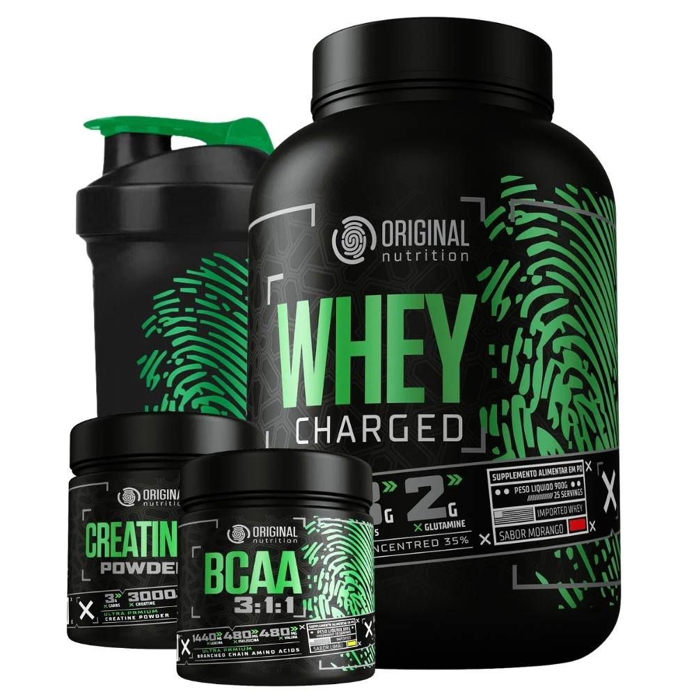 Kit Whey Protein Charged Original + Bcaa + Creatina + Shaker – Melhor custo benefício